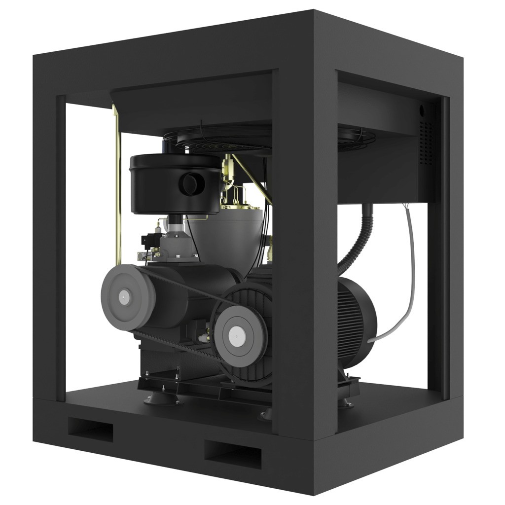 Передача крутящего момента осуществляется через систему шкивов и ремней, что обеспечивает плавную работу, снижает нагрузку на винтовой блок и минимизирует вибрации. Такая конструкция позволяет рационально разместить внутренние узлы, уменьшая габариты оборудования и продлевая срок его службы.