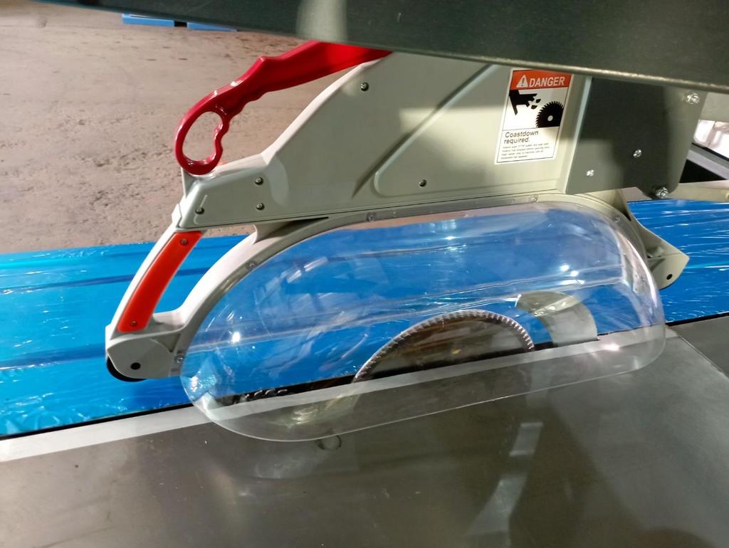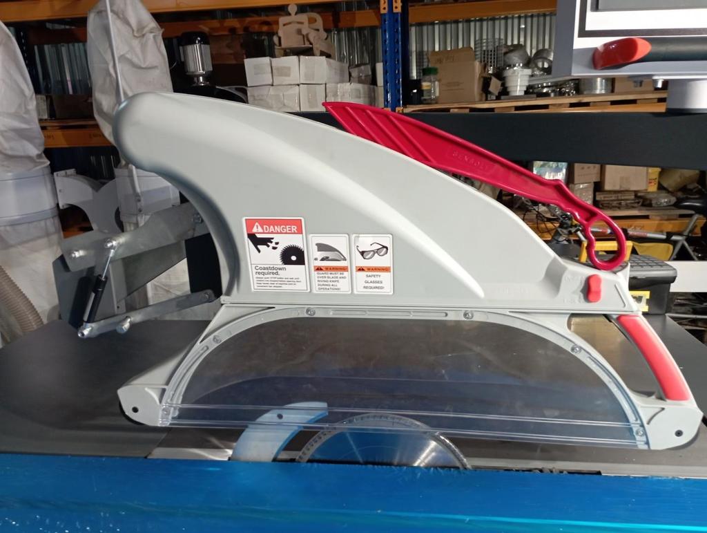 - Параллелограммный прозрачный защитный кожух с поворотной штангой — повышает безопасность и обзор зоны распила.