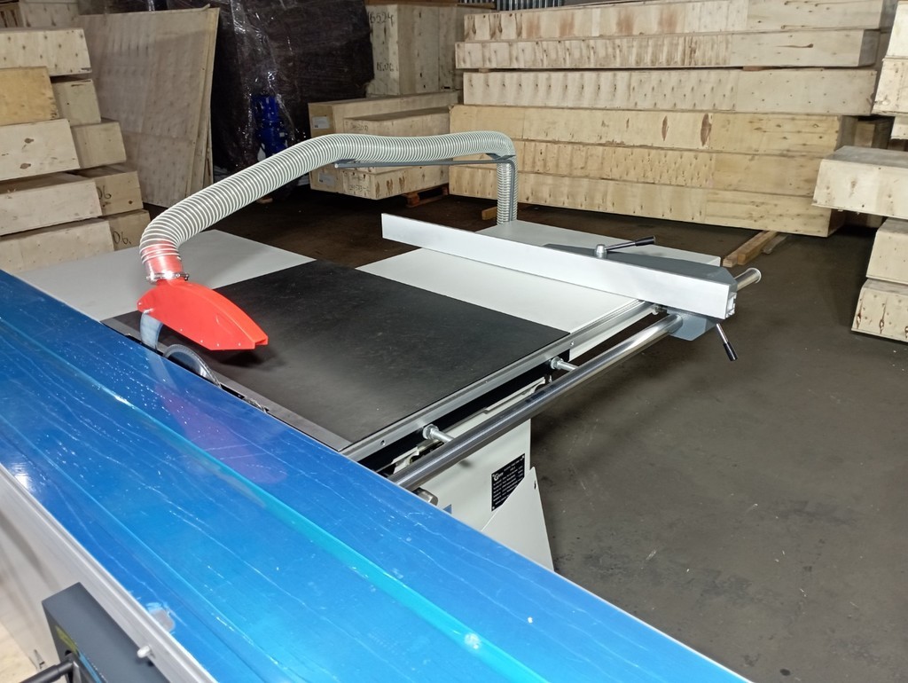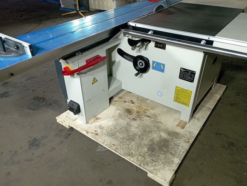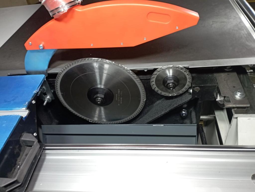 Пильный узел выполнен в литом корпусе, который надежно защищает механизмы от вибрации. В состав узла входят две пилы — основная и подрезная, каждая с отдельным электрическим двигателем. Такая компоновка исключает перегрузки и обеспечивает стабильную работу оборудования. Подрезная пила вращается в направлении подачи материала, что позволяет выполнять чистый раскрой ламинированных плит без сколов.