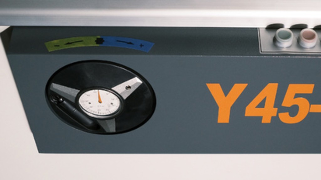 Для точной настройки подрезного устройства используются удобные рукоятки регулировки, расположенные со стороны оператора. Поворотная линейка позволяет устанавливать материал под углом от 90° до 45°, а усиленный форматный стол обеспечивает надежную поддержку даже при обработке крупногабаритных деталей.