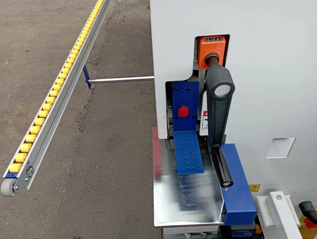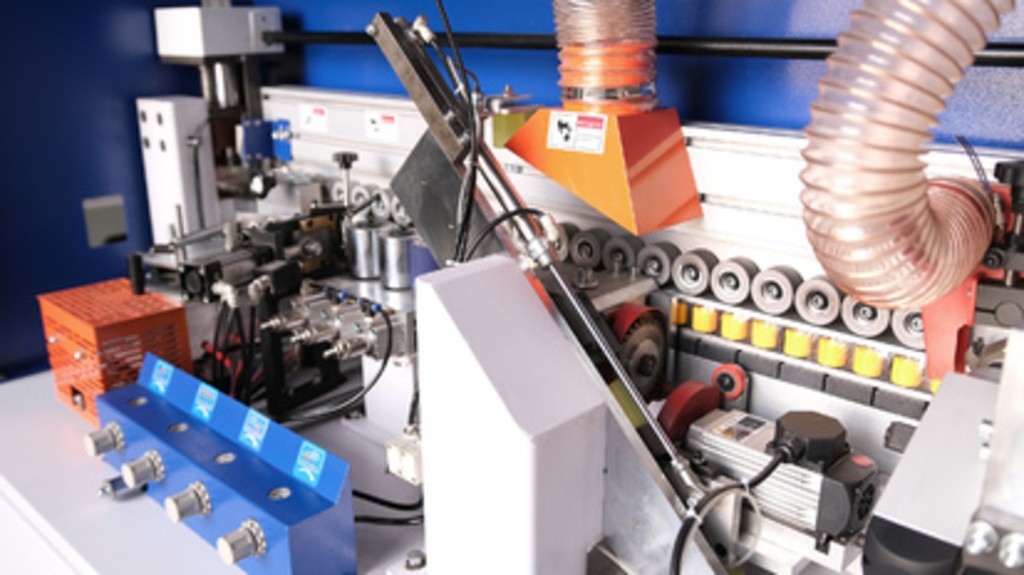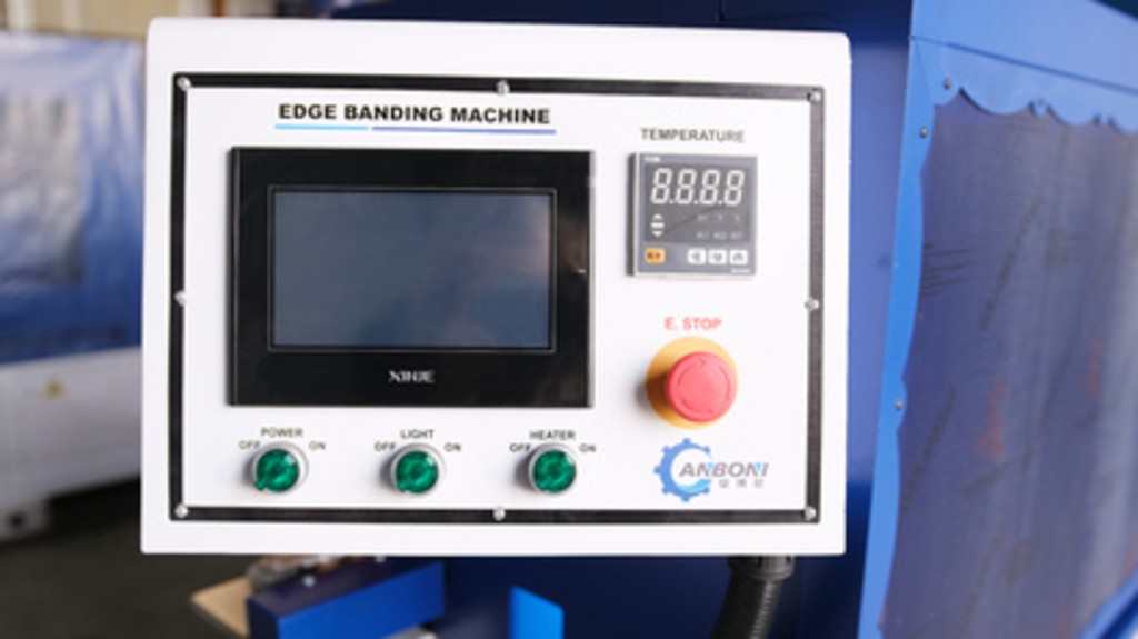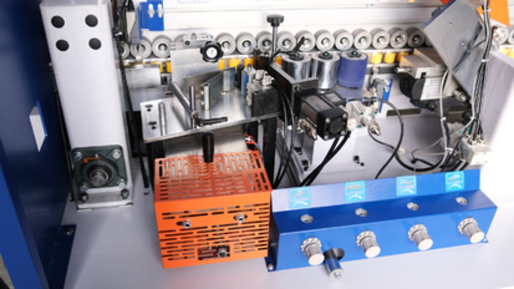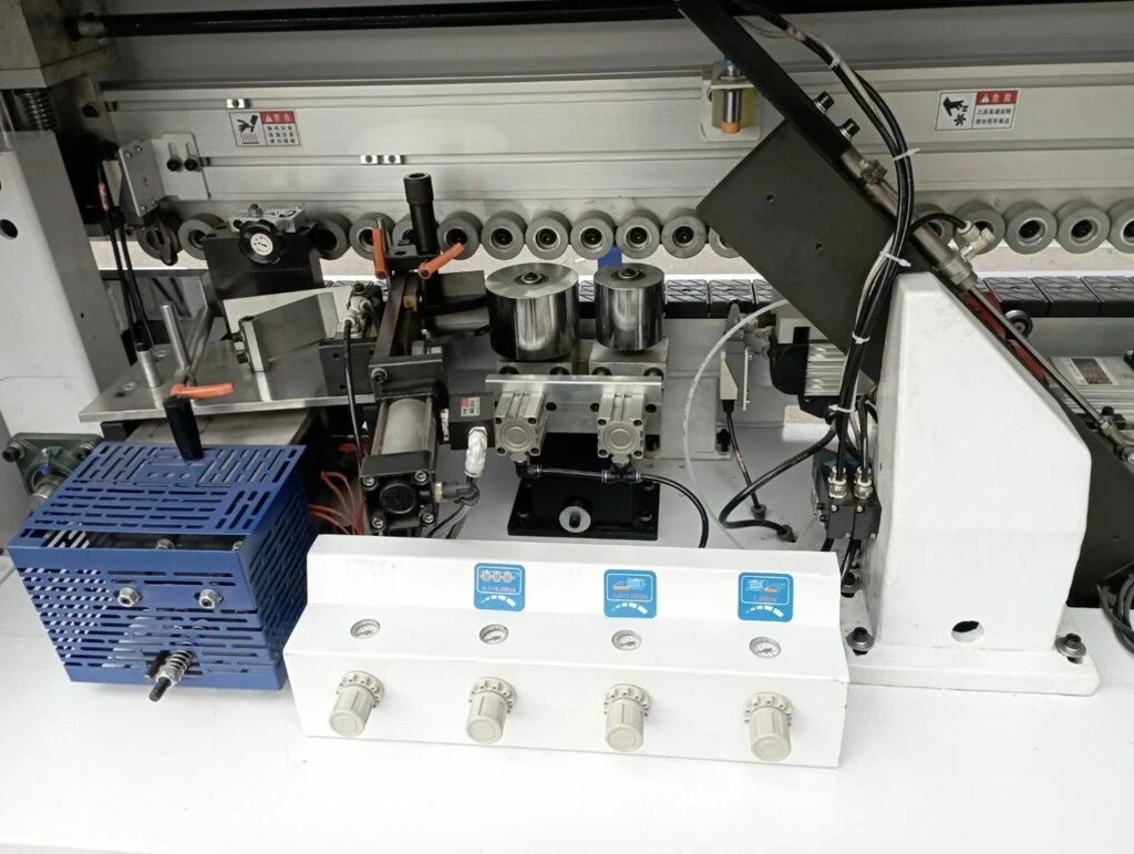 Устройство оснащено сенсорным экраном управления, электронным регулированием температуры клеевой ванны и скорости подачи заготовок. Система нанесения клея оборудована бачком с электронным контролем температуры и функцией регулировки количества клея, что гарантирует равномерное и прочное приклеивание по всей длине кромки.