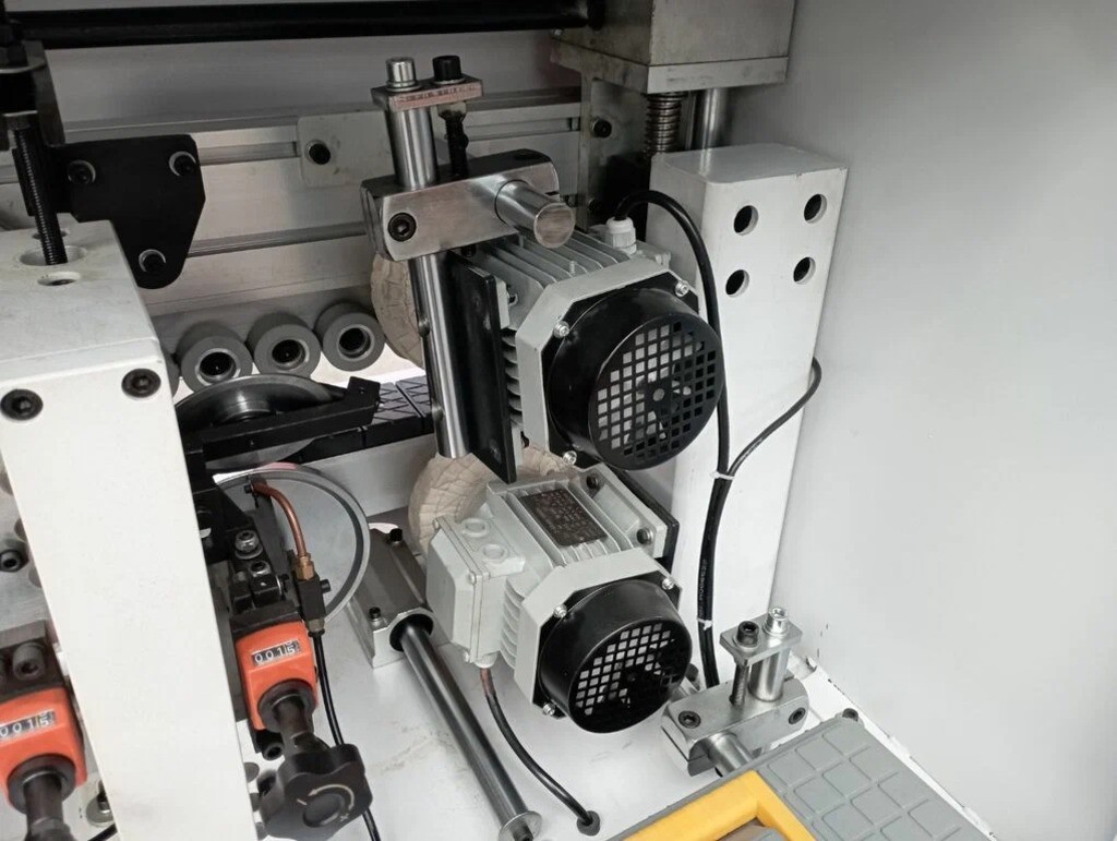 Торцовочный узел выполнен с двумя высокочастотными моторами, обеспечивающими чистовую обрезку кромки спереди и сзади. Фрезерный блок с твердосплавными фрезами аккуратно снимает свесы, а циклёвочный и полировальный узлы придают кромке безупречную гладкость и блеск.