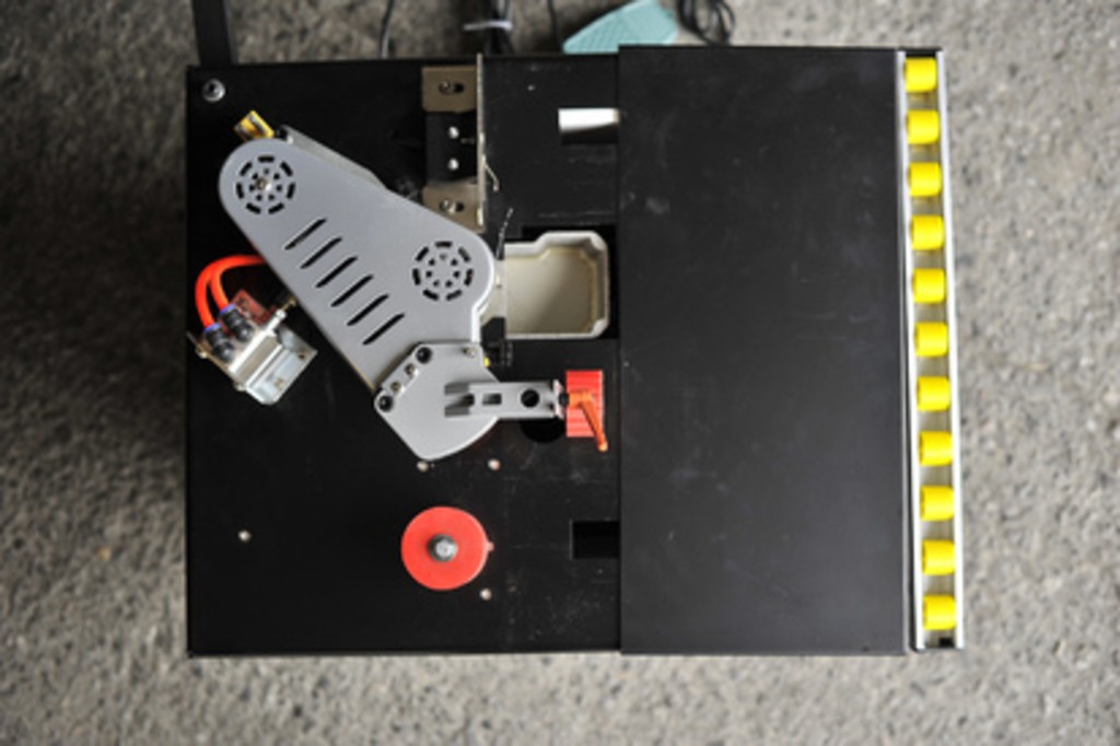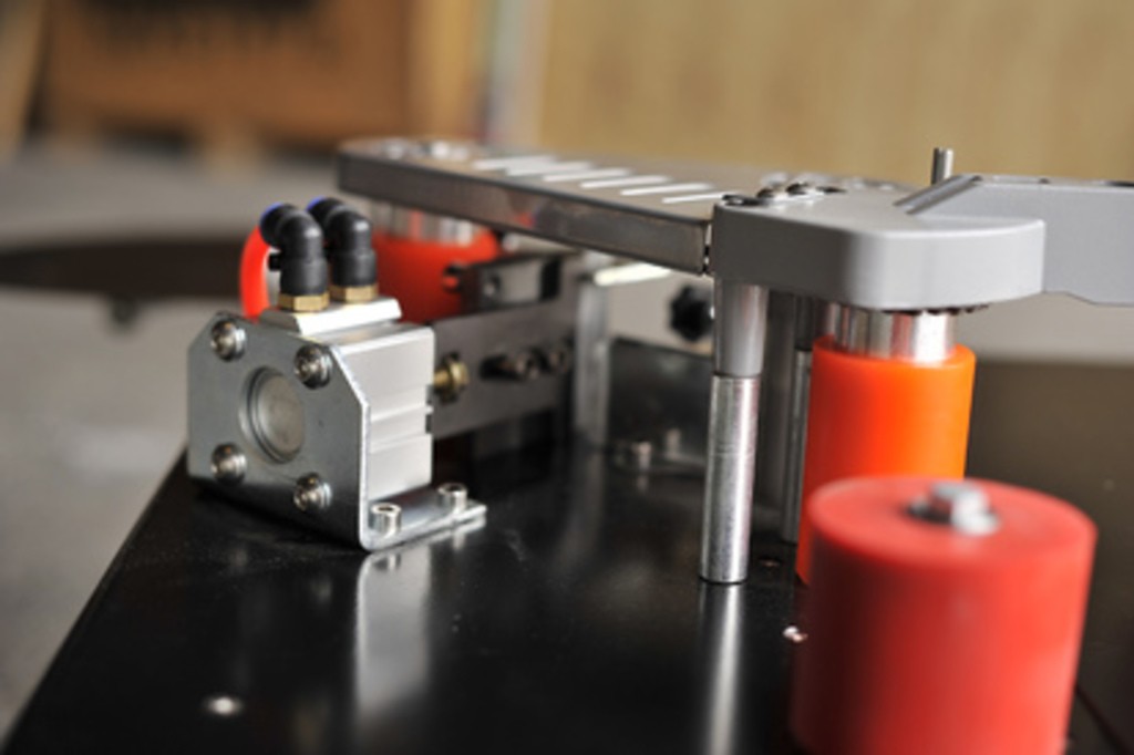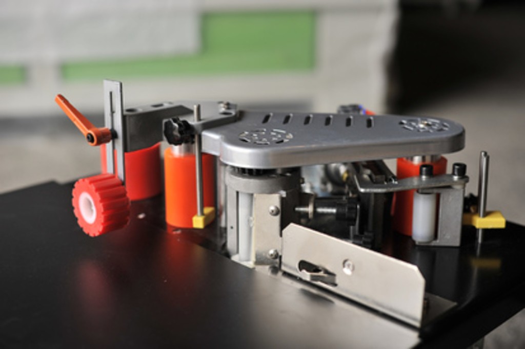 Станок MY 07B работает с лентами из ПВХ, АБС, меламина и натурального шпона шириной от 10 до 60 мм и толщиной от 0,4 до 3 мм. Приклеивание выполняется при ручной подаче заготовки, а подача и обрезка кромочного материала осуществляется при помощи педали и концевого выключателя.