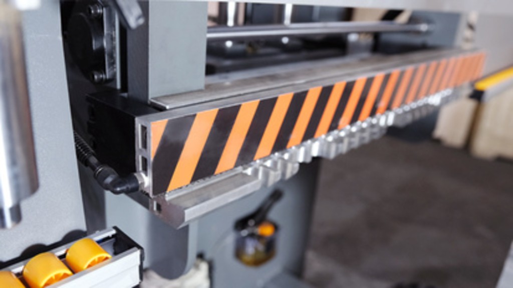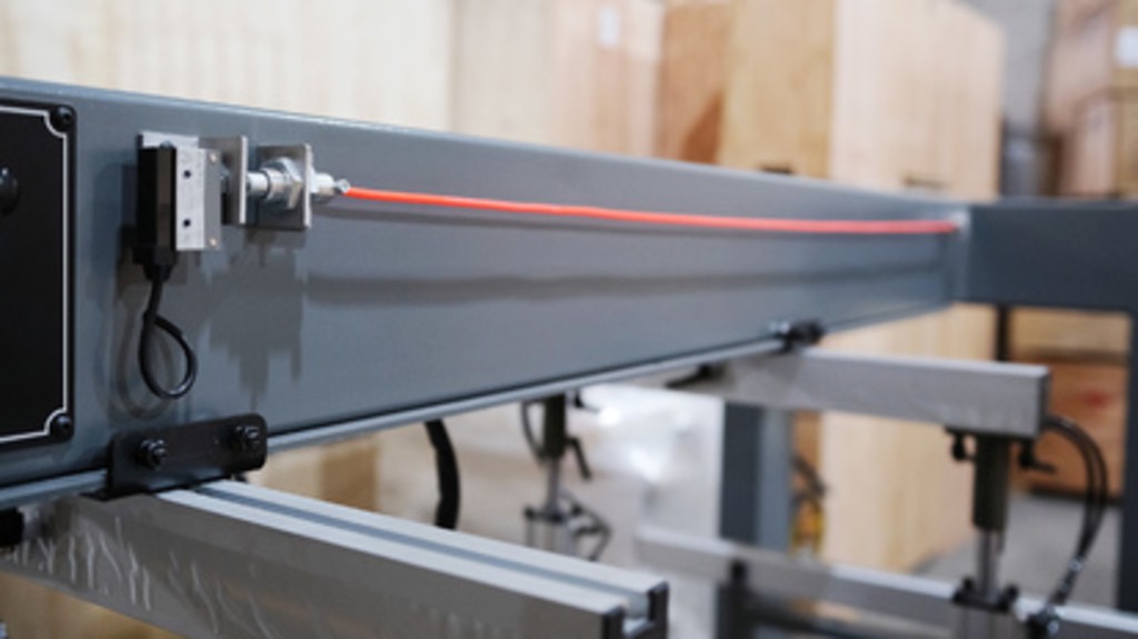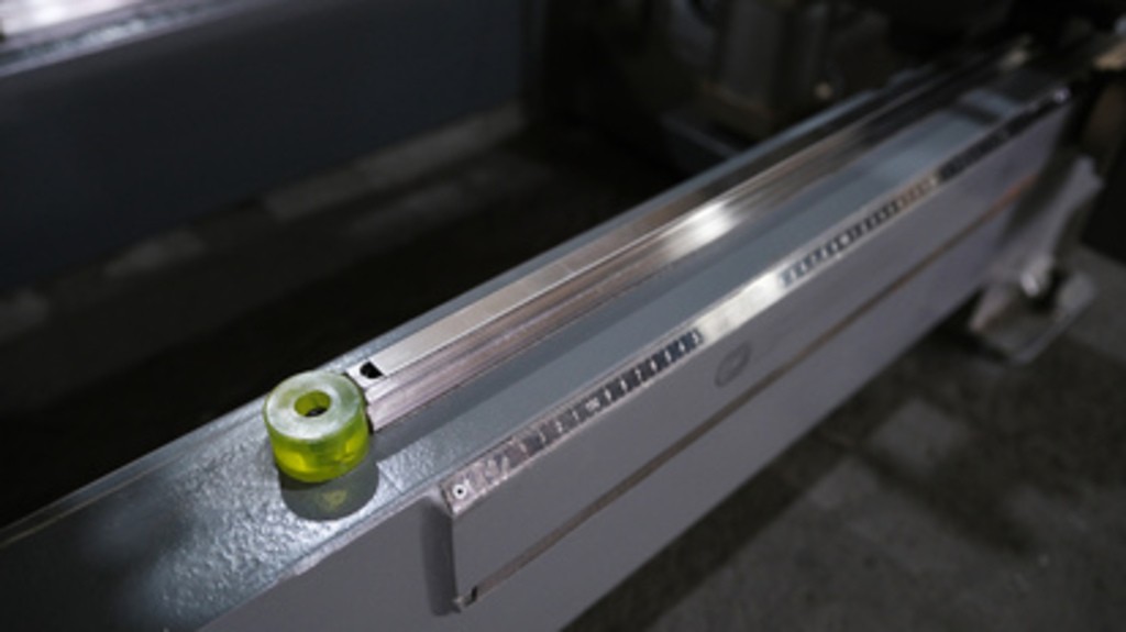 Алюминиевая направляющая длиной 3000 мм с четырьмя пневматическими упорами и упорной гребёнкой.