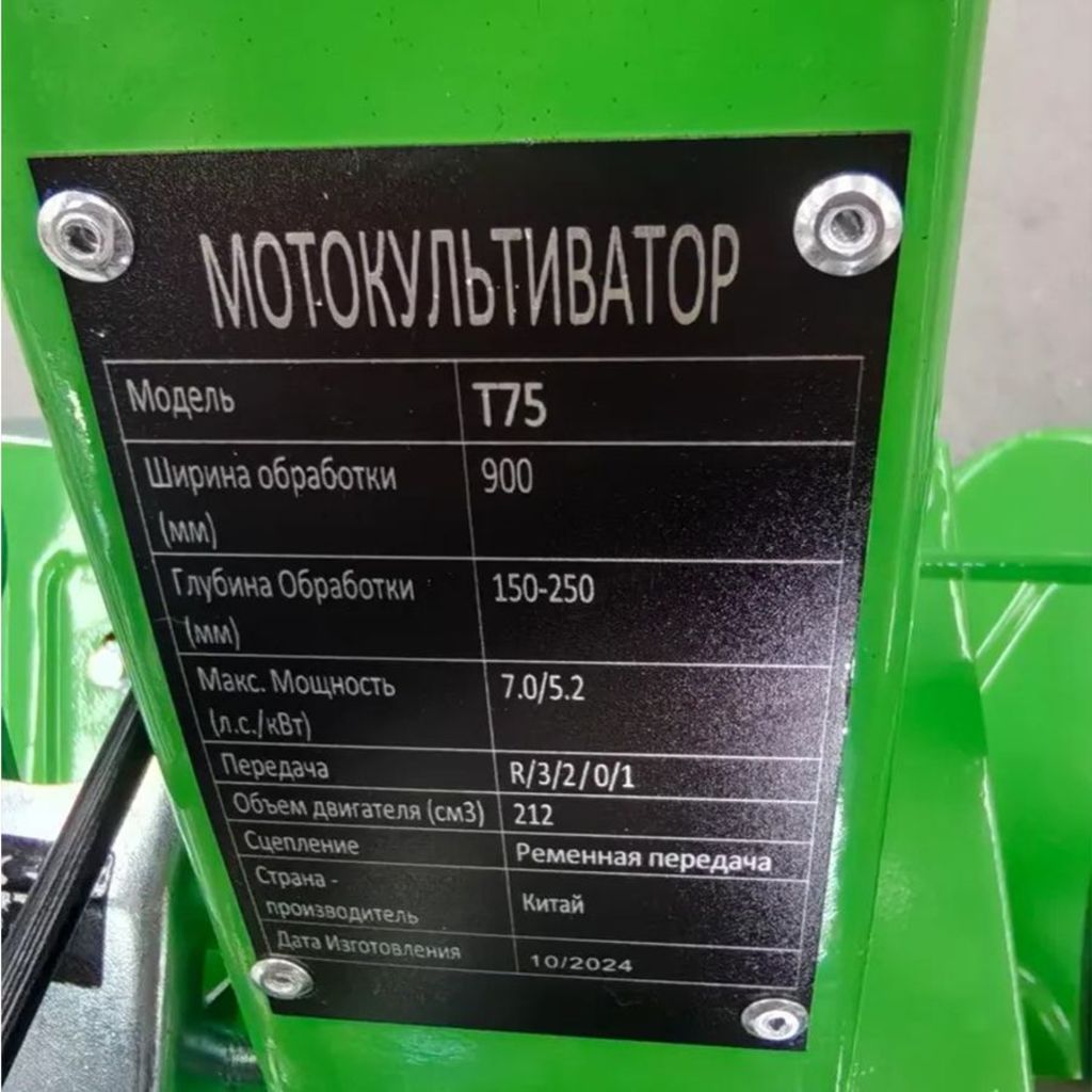 В основе устройства — 4-тактный бензиновый двигатель мощностью 7,0 л.с. (5200 Вт), который обеспечивает стабильную работу даже при длительных нагрузках. С его помощью культиватор способен обрабатывать крупные участки земли с шириной захвата до 900 мм и глубиной до 250 мм.