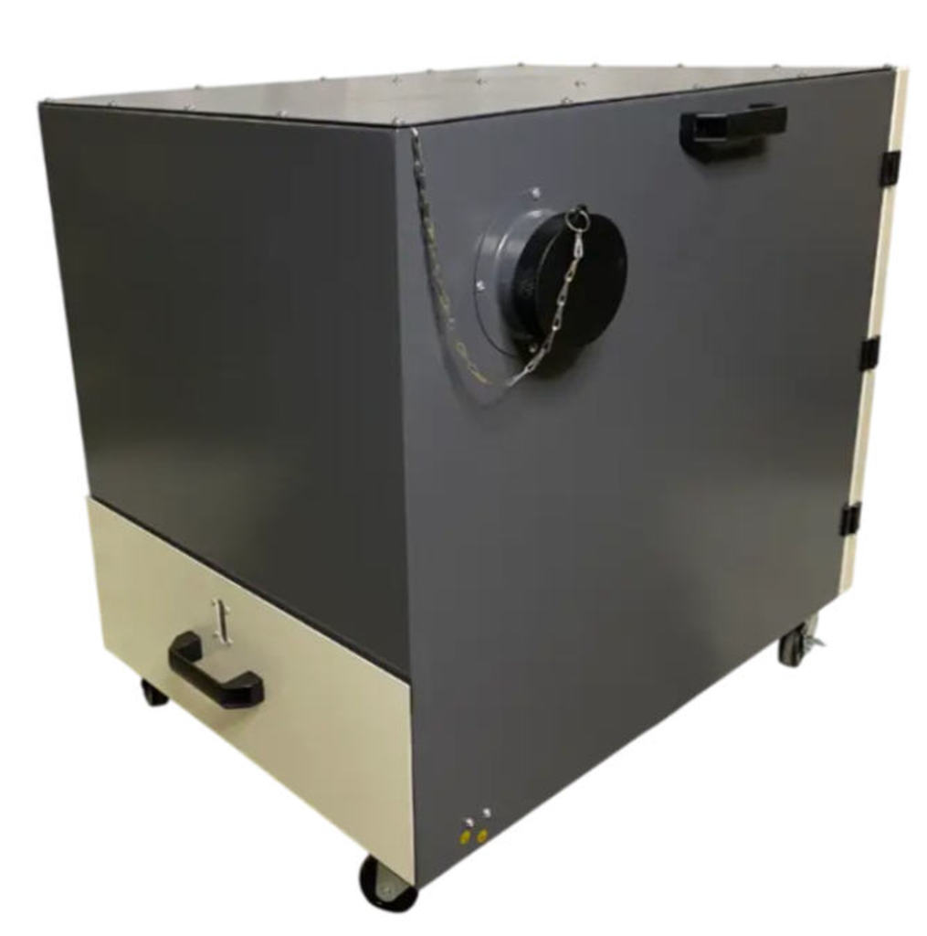 В основе вытяжки установлен мощный центробежный вентилятор, создающий стабильное разрежение и интенсивный поток воздуха. Отходы обработки быстро перемещаются в разделительный узел: тяжёлая стружка оседает в увеличенном выдвижном контейнере, а мелкая металлическая пыль задерживается огнеупорным фильтр-мешком. Для тонкой доочистки предусмотрены два фильтр-картриджа, расположенные в дверце корпуса — они обеспечивают максимальную чистоту выходящего воздуха.
