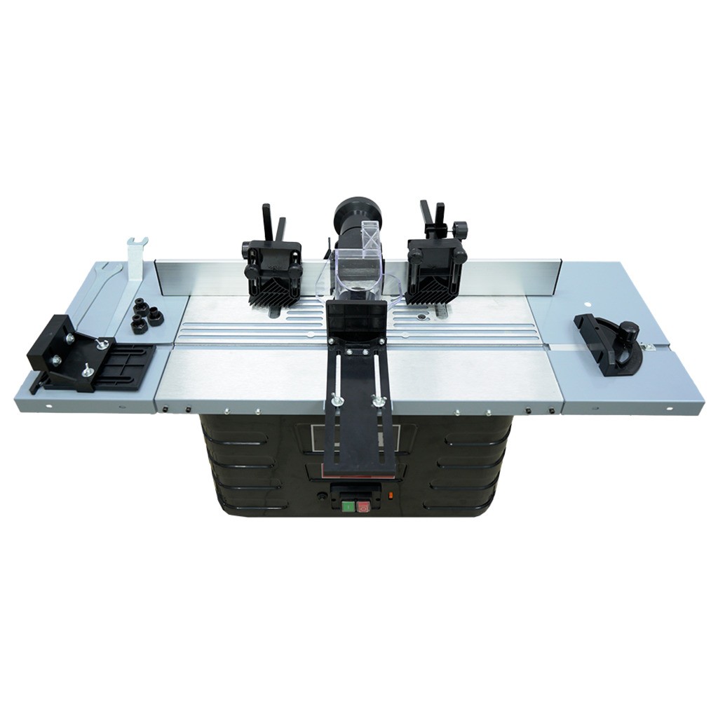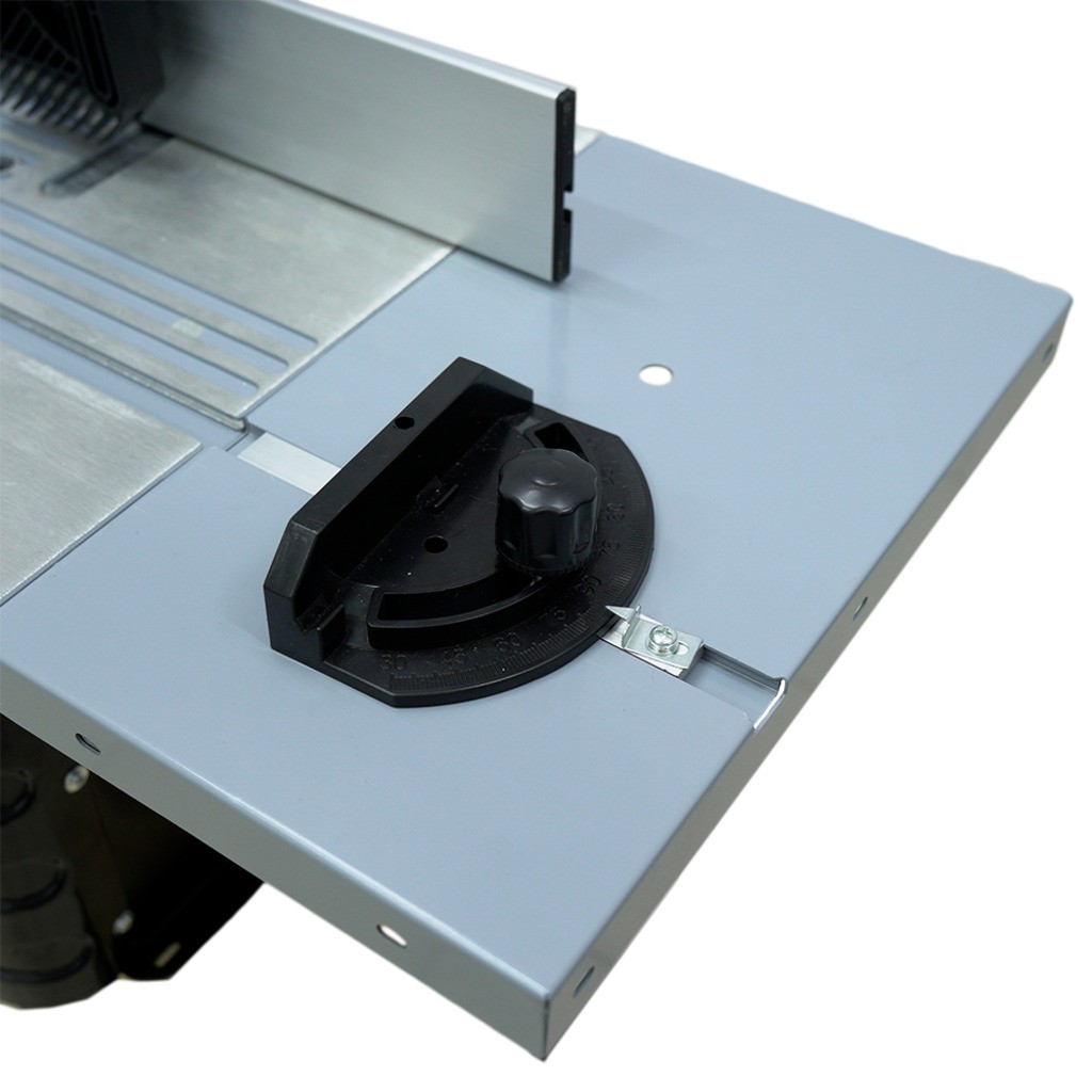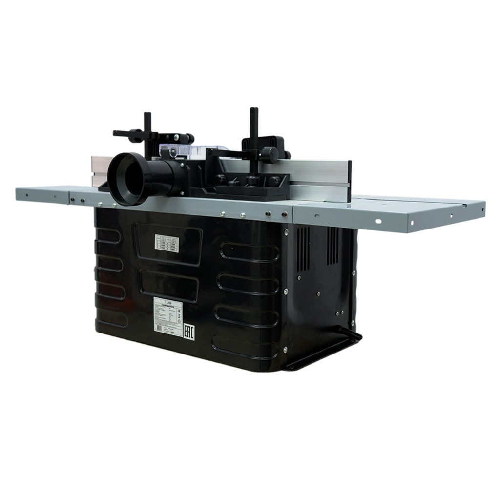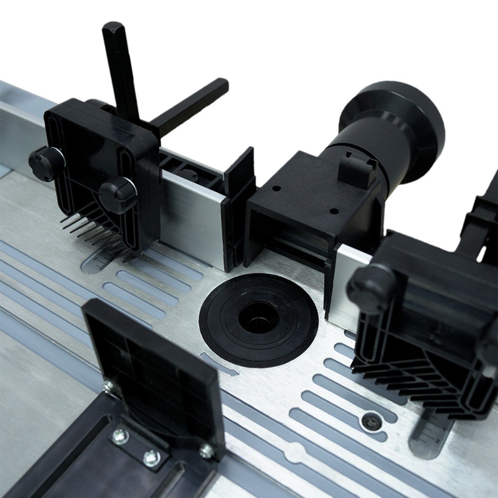 - Надёжная фиксация заготовки — в комплекте верхний и фронтальный прижимы, параллельный и угловой упоры (транспортир), упор с защитой от обратной отдачи.
