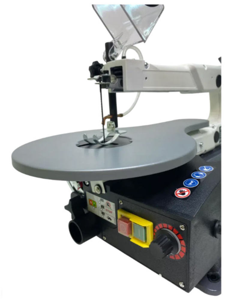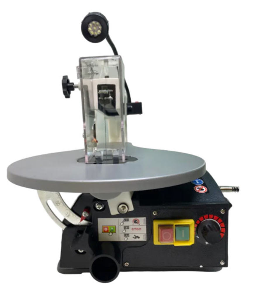 Станок поддерживает распиловку под углом, что особенно важно при изготовлении декоративных элементов, шкатулок, моделей, профилей и других изделий со сложной геометрией. Встроенное аспирационное отверстие дает возможность подключить строительный или промышленный пылесос, улучшая обзор линии реза и поддерживая чистоту рабочего места.