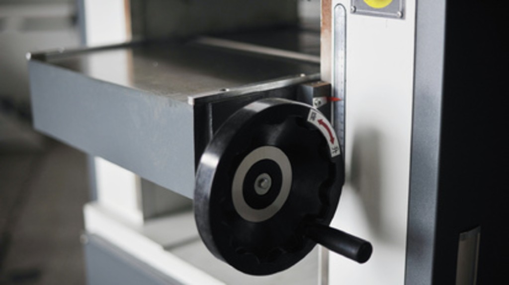 Ручной подъём и опускание стола. Настройка выполняется плавно и точно с помощью бокового маховика, положение контролируется по линейке.