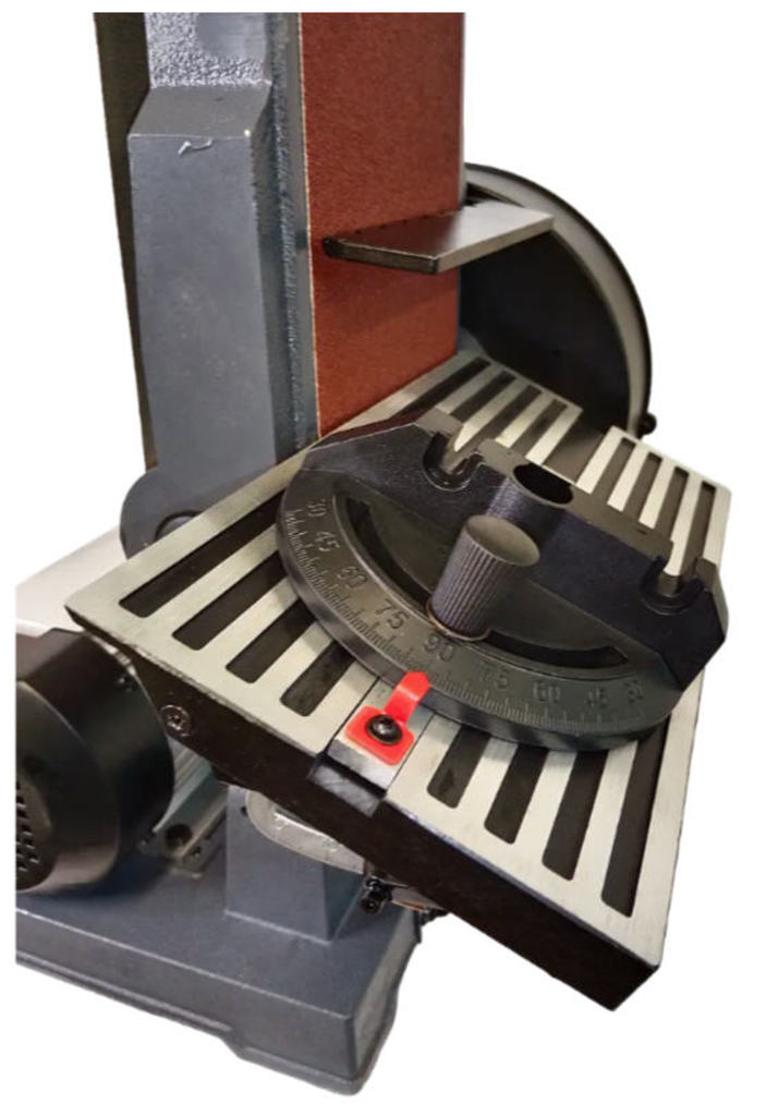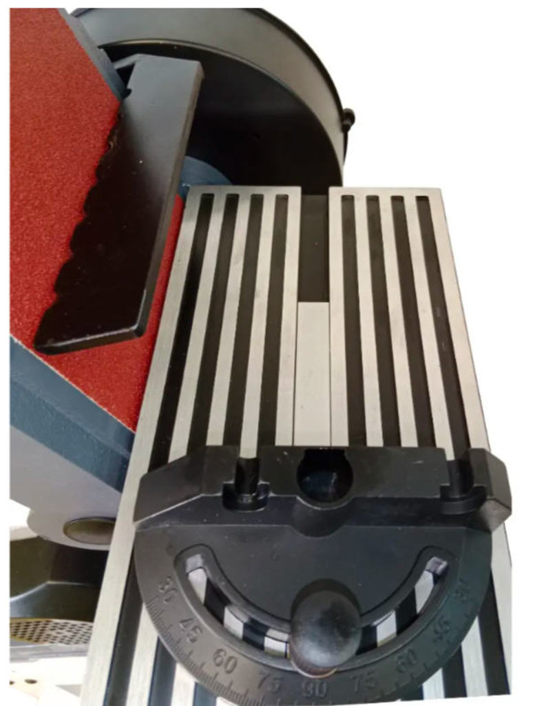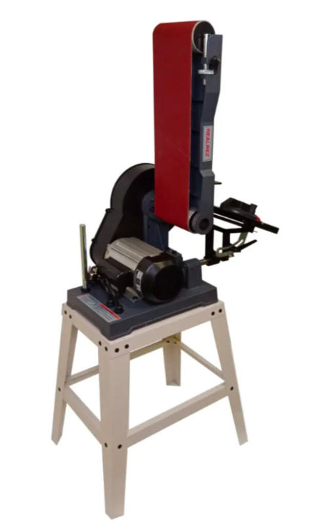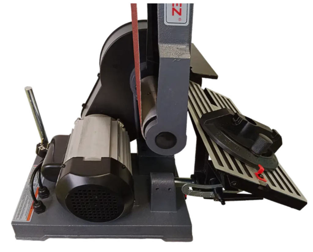 Ленточный узел поворотный, а диапазон регулировки угла стола составляет 0–60°, что позволяет выполнять сложные фаски и фигурные элементы. Для дискового узла угол наклона регулируется в пределах 0–45°. В станке используются стандартные абразивы: шлифовальная лента 1219 × 152 мм и диск диаметром 228 мм, что делает расходные материалы доступными и простыми в замене.
