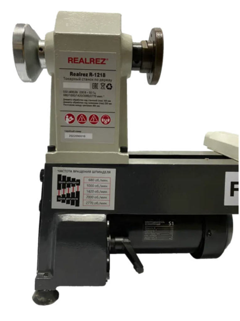 REALREZ R-1218 550 W станок имеет пять скоростей, их смена осуществляется перемещением приводного ремня по ступеням шкива шпинделя передней бабки и соответствующей ей ступени шкива электродвигателя. Переход между скоростными режимами осуществляется без инструментальной перестановкой клинового ремня.