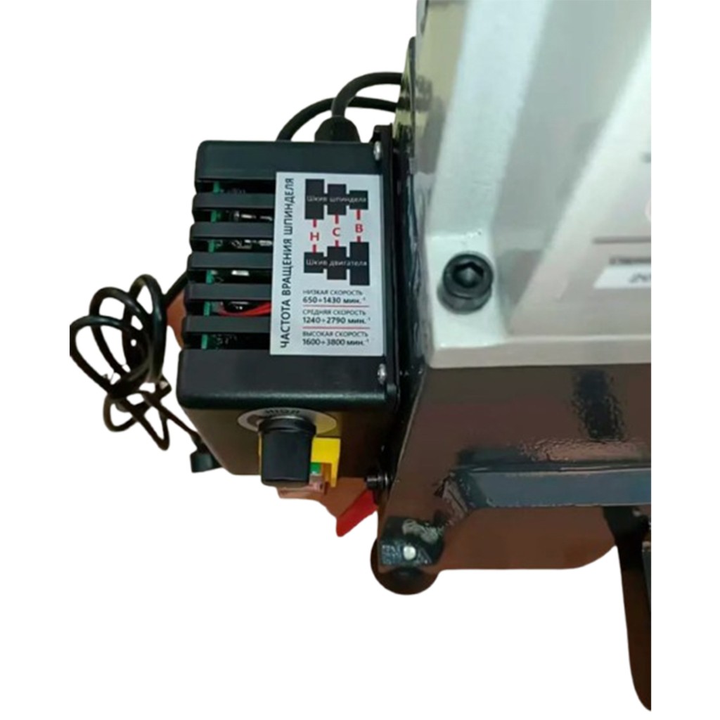 REALREZ R-1218VD 550 W На данном токарном станке установлен коллекторный двигатель (550 Вт) с тремя диапазонами скоростей 650÷1450/1250÷2800/1600÷3800. Для удобства настройки скорости предусмотрен дисплей скорости шпинделя. Переход между скоростными режимами осуществляется без инструментальной перестановкой клинового ремня.